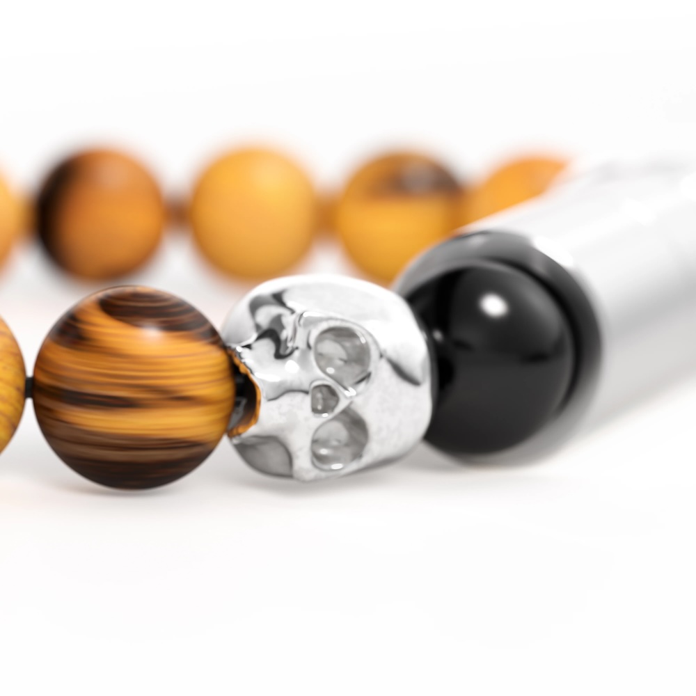 Symbole de la prise de conscience de notre propre mortalité, les crânes en argent servant d'entretoises ajoutent une touche sophistiquée à ce bracelet en onyx noir et œil de tigre mat.
