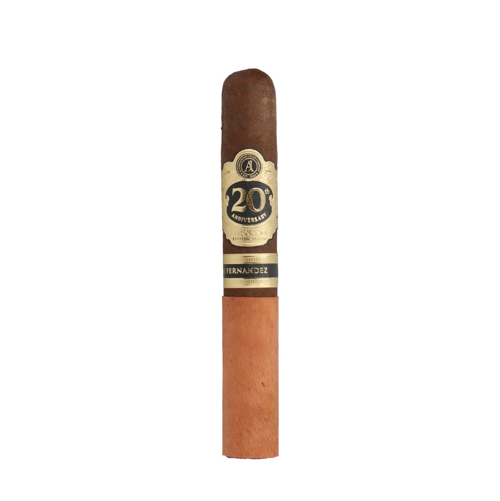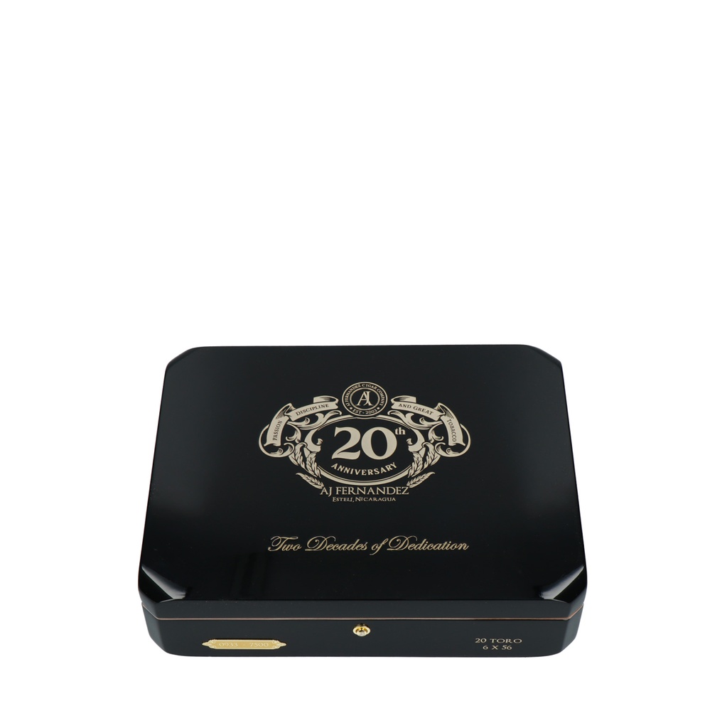 Cela figure également sur les boîtes du 20e anniversaire d'AJ Fernandez , que la société a produites pour son 20e anniversaire. Avec son cigare d'anniversaire, il a tenté de résumer le parcours de ces 20 années et de réaliser un assemblage qui représente toutes ses fincas. De nombreux tabacs proviennent d'anciennes réserves. Cela se reflète clairement dans le goût : le grand format Toro est élégant. Dans ce cigare, l'épice typique de la maison devient une fumée finement épicée avec beaucoup de densité. L'arôme associe des notes de cacao et de douceur, du bois, des notes forestières et de noisette. La construction : « impeccable ».