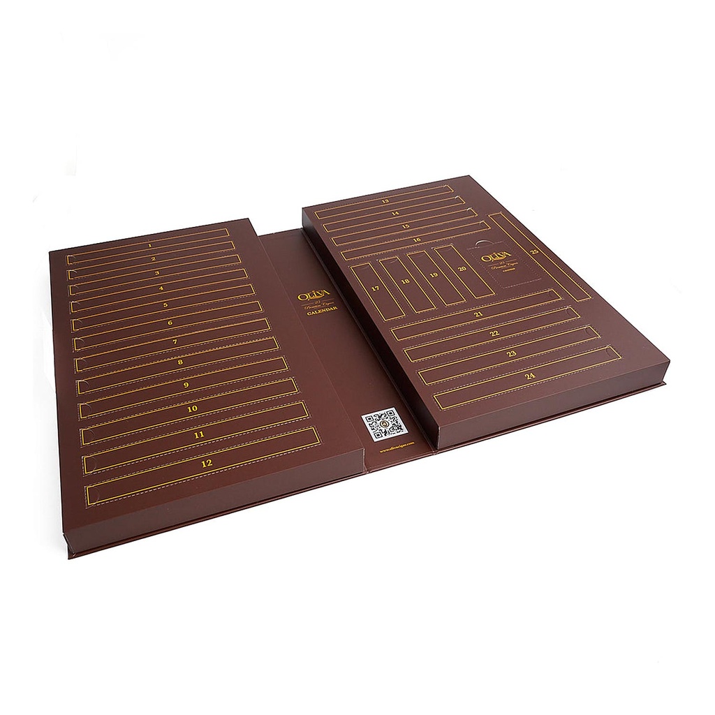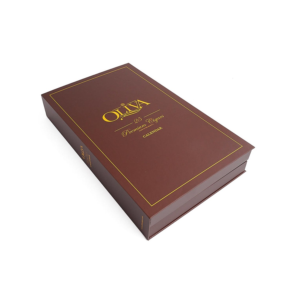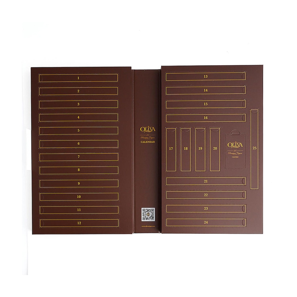 Dans ce calendrier pas comme les autres se cache une collection exquise de 25 cigares soigneusement sélectionnés et dévoilant chacun un nouveau profil aromatique et un savoir-faire artisanal inégalé. Un briquet Oliva se cache également derrière l'une des fenêtres.