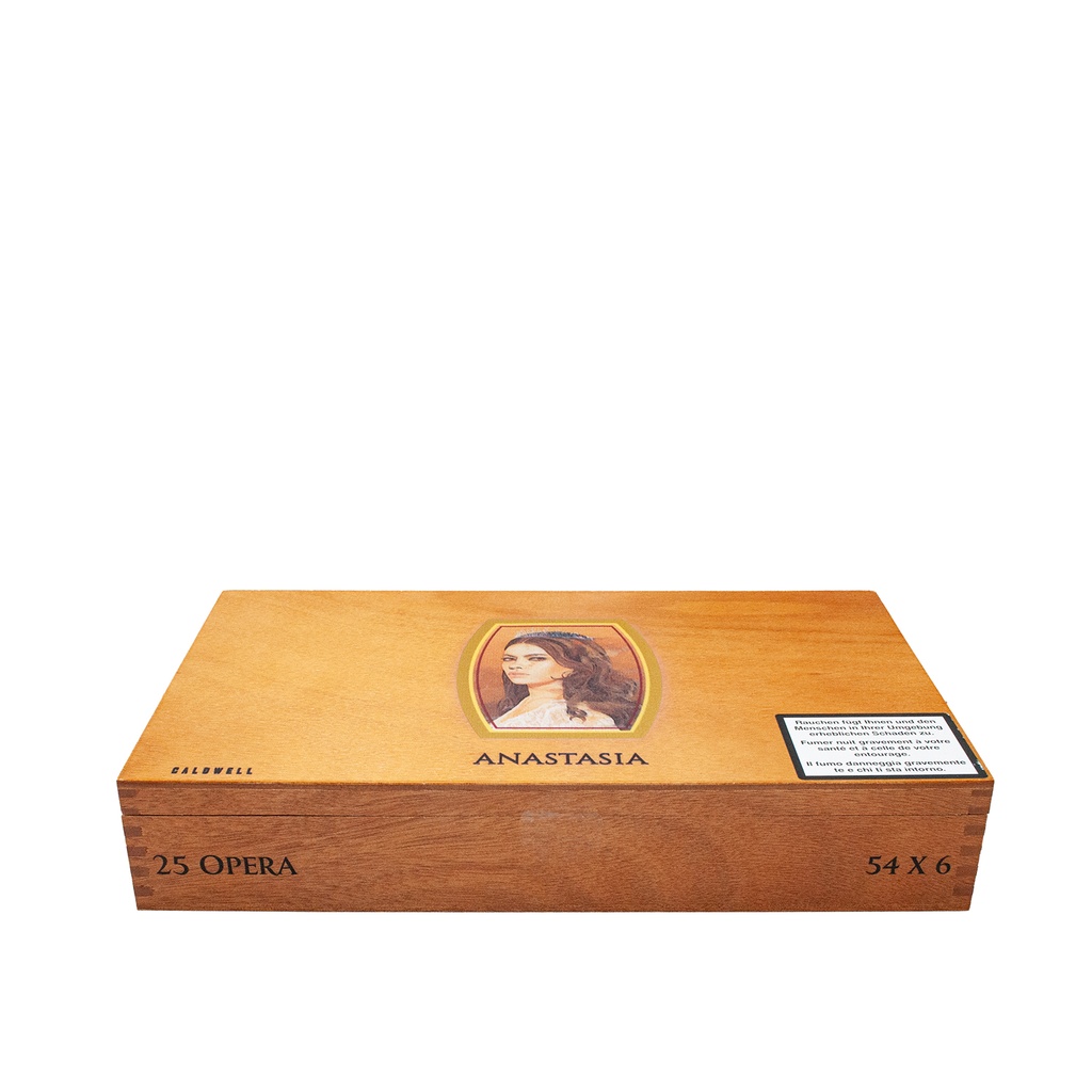 Les boîtes en bois clair et le design délicieusement rétro de l’ensemble mettent bien en valeur les cigares. La princesse Anastasia, fille du Tsar Nicolas II, nous toise depuis la magnifique vista sérigraphiée sur les deux faces du couvercle, comme sur l’une des deux bagues jaune clair. Avant dégustation, la cape dégage des senteurs chocolatées, crémeuses, ou encore boisées.