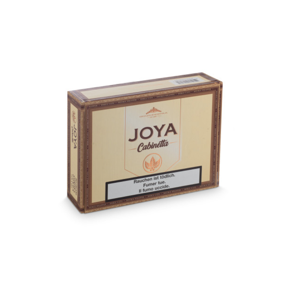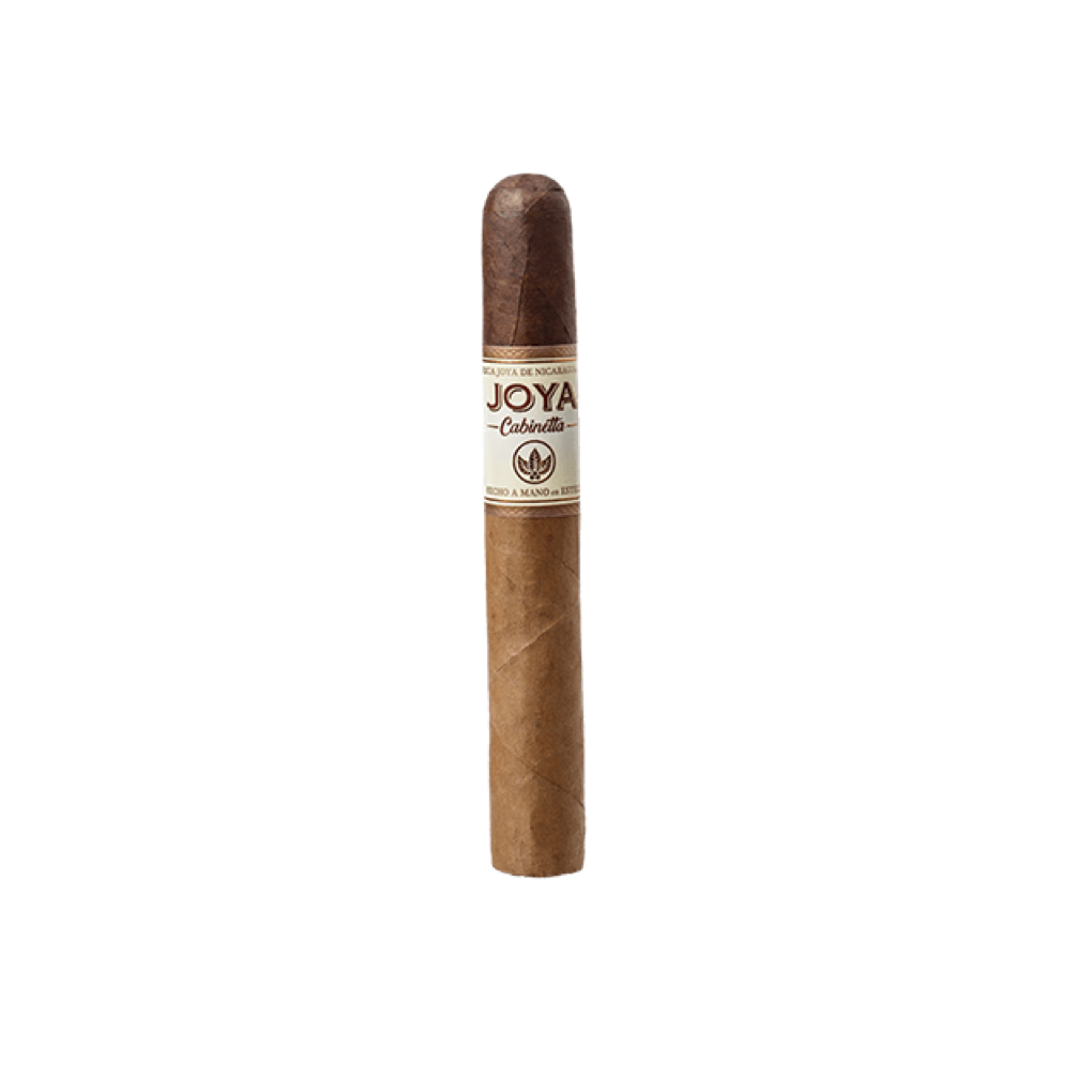 Joya Cabinetta est bicolore grâce à ses deux feuilles de cape, dont une Connecticut d’Équateur, la plus claire, et une Criollo du Nicaragua cultivée au soleil pour les pointes poivrées. Cette dernière couvre un tiers du cigare environ.