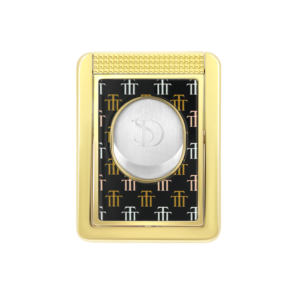 Ce coupe-cigares doublé d’un stand / repose-cigares est décoré du monogramme Trinidad en laque brillante et finitions dorées.