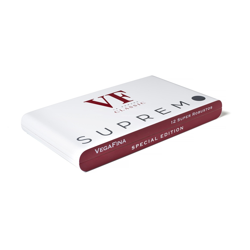 Signe de son excellence, le VegaFina Supremo a obtenu une note de 92 points dans le Cigar Journal. VegaFina Classic Supremo est livré dans une boîte originale laquée de 12 cigares, ornée du nouveau logo VF et de l'emblème « Supremo » de la marque. Les cigares, dont les bagues sont assorties au design de la boîte, présentent également le nouveau logo VF. La boîte en bois d'Okume est également sérigraphiée avec le logo de la marque.