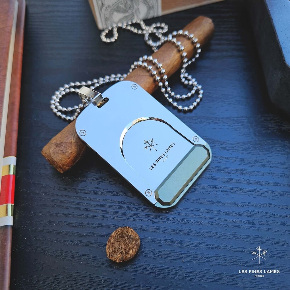 Inspiré de l'emblématique dog tag issu du monde militaire, le tag Les Fines Lames T135 s'intègre parfaitement à votre style quotidien. Ultra fin (3,15 mm) et solide, chaque pièce est fabriquée en France avec deux lames en acier inoxydable 420C, offrant une coupe parfaite à chaque fois.