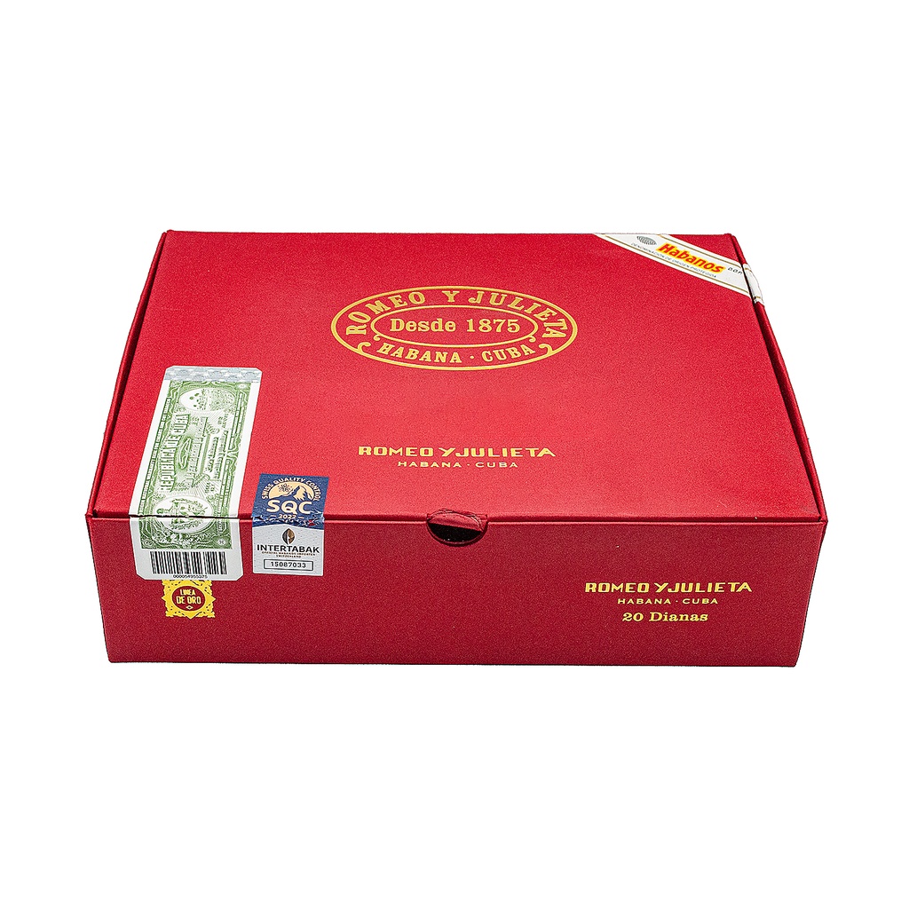 Le Linea de Oro Dianas est présenté dans une boîte sophistiquée qui reflète son pedigree exceptionnel. L’emballage, tout en élégance, incarne la tradition et le soin apporté à chaque cigare. De la cape lisse et brunâtre à la bague dorée portant le nom emblématique de Romeo Y Julieta, chaque détail augmente l’anticipation de la dégustation.