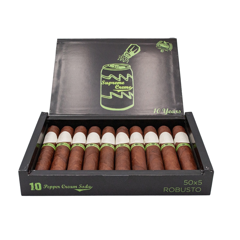 Le Pepper Cream Soda 10th Anniversary de chez Robert Caldwell est un Robusto composé de tabacs sélectionnés et patiemment vieillis depuis 2012. La cape pleine de tempérament et mûrie au soleil entoure un assemblage de tabacs puissants, dont l'origine reste secrète. Un cigare festif, avec beaucoup de nuances mais surtout beaucoup de caractère: de franches notes boisées, de noix et de crème, ainsi que des pointes épicées. Très rassasiant, il ravira les amateurs avertis.