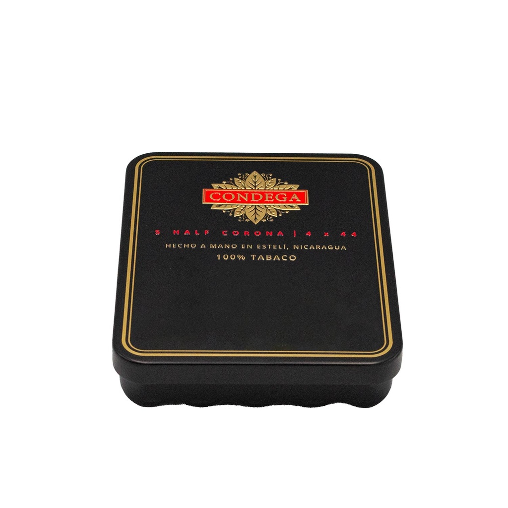 Le Condega Half Corona est une nouvelle vitole parfaite pour vous accompagner dans la vie quotidienne. Il s’agit d’un format court mais savoureux (ring 44), présenté dans une boîte pratique en métal de 5 cigares. Le mélange utilise des tabacs Corojo, Seco de Jalapa et du Corojo de Condega et Estelí.